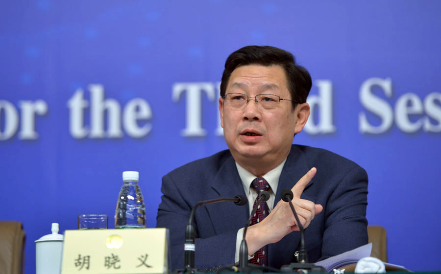 ??? 全國政協(xié)十二屆三次會議舉行記者會,邀請全國政協(xié)常委朱維群、黃潔夫和全國政協(xié)委員胡曉義、李彥宏、俞敏洪等談促進民生改善與社會和諧穩(wěn)定,并回答記者提問。圖為胡曉義答記者問。新華網(wǎng)/中國政府網(wǎng) 郭小天 攝