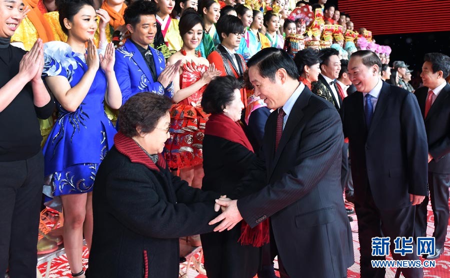 ??? 2月5日,中共中央政治局委員、中央書記處書記、中宣部部長劉奇葆在北京中央電視臺春節(jié)聯(lián)歡晚會(huì)彩排現(xiàn)場,親切看望正在緊張工作的演職人員。新華社記者 張鐸 攝