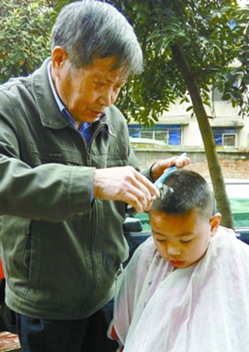 推、梳、刷、刮……很快,一個(gè)漂亮的小平頭剪好了。當(dāng)?shù)鼐用駝娂敉觐^發(fā),摸摸頭,滿意地向梁老致謝,并給老人遞上1塊錢。今年76歲的梁志高,這已經(jīng)是他義務(wù)為群眾理發(fā)的第52個(gè)春秋。