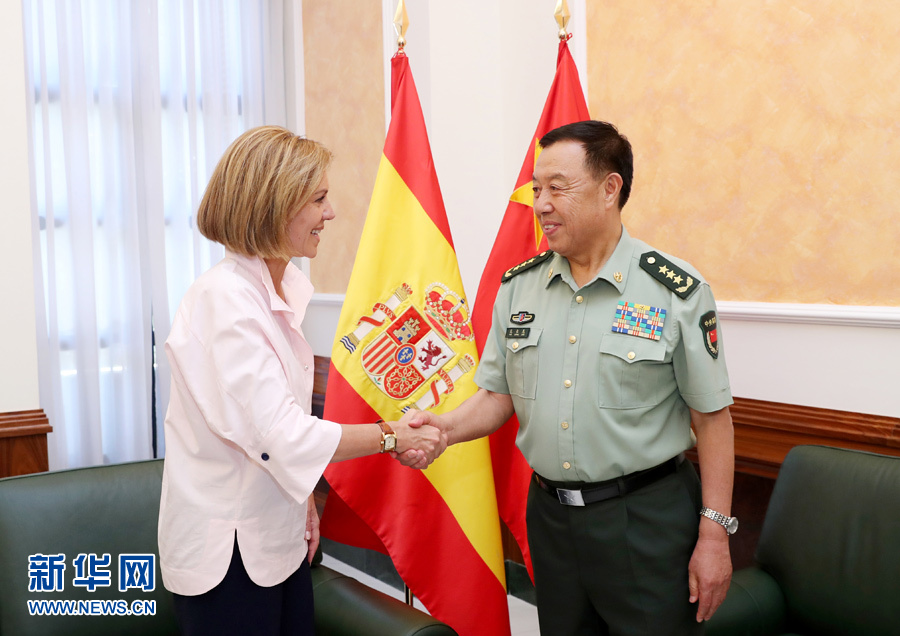 6月13日,中央軍委副主席范長龍(右)在馬德里會(huì)見西班牙國防大臣德科斯佩達(dá)爾。 新華社發(fā)(李曉偉攝)