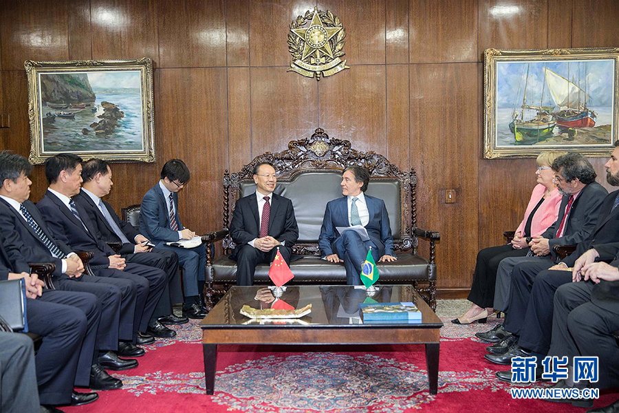 7月11日,在巴西首都巴西利亞,中共中央書記處書記、全國(guó)政協(xié)副主席杜青林(中左)會(huì)見巴西參議院議長(zhǎng)歐尼西奧·奧利維拉(中右)。新華社記者李明攝