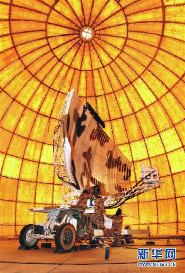 駐守藏北某雷達(dá)站擔(dān)負(fù)節(jié)日值班工作的官兵,精心檢查維護(hù)雷達(dá)天線,確?!扒Ю镅邸泵髁粒?011年1月30日攝)。新華社發(fā)(劉應(yīng)華 攝)