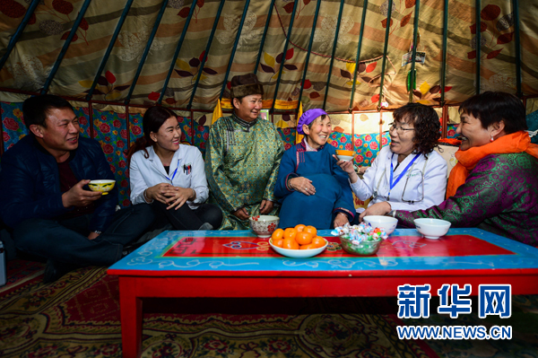 家庭責(zé)任醫(yī)務(wù)人員與阿巴嘎旗牧民道力格爾瑪一家拉家常(2月20日攝)。為緩解牧民看病難問題,從2013年起,阿巴嘎旗給超出衛(wèi)生院服務(wù)半徑10公里的每戶牧民配備小藥箱,安排家庭責(zé)任醫(yī)生,還購(gòu)買了12臺(tái)內(nèi)置B超機(jī)、心電圖機(jī)、尿液分析儀等醫(yī)療設(shè)備的流動(dòng)服務(wù)車。新華社記者 連振 攝
