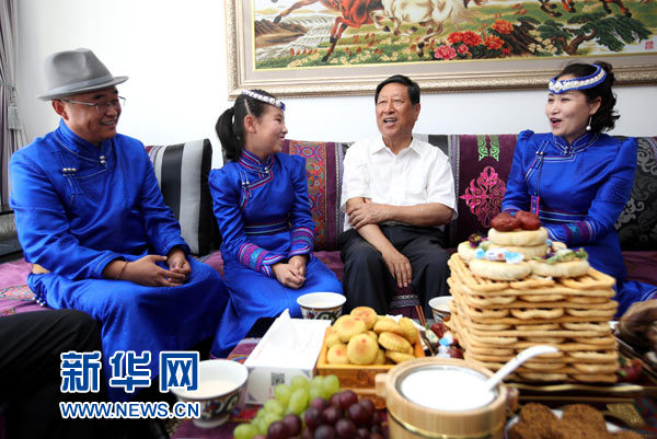 這是張平在蒙古族居民哈斯戈日樂(lè)(右一)家詳細(xì)詢問(wèn)全家工作和生活情況。新華社記者 鄧華 攝