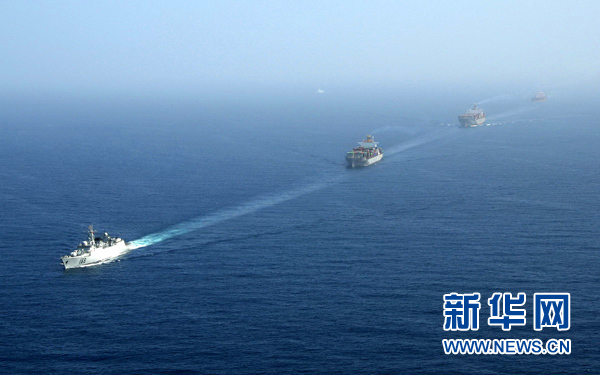 2009年1月6日,在中國海軍護航艦艇編隊武漢號導(dǎo)彈驅(qū)逐艦的帶領(lǐng)下,被護航的中國商船一字排開航行。 2009年4月28日,中國人民解放軍海軍第一批赴亞丁灣護航編隊,圓滿完成護航任務(wù)后返回海南三亞某軍港。由武漢號導(dǎo)彈驅(qū)逐艦、??谔枌?dǎo)彈驅(qū)逐艦和微山湖號綜合補給艦組成的海軍首批護航編隊,在124個日夜里連續(xù)航行33000多海里,為41批166艘船舶實施了伴隨護航,為46艘船舶提供了區(qū)域護航,成功救援了3艘遇襲外國船只,安全、順利、圓滿地完成了護航任務(wù)。新華社發(fā)