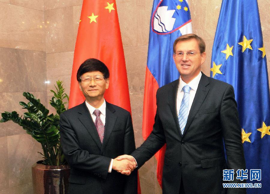 9月15日,在斯洛文尼亞盧布爾雅那,斯洛文尼亞總理采拉爾(右)會(huì)見到訪的習(xí)近平主席特使、中共中央政治局委員、中央政法委書記孟建柱。新華社記者汪亞雄攝