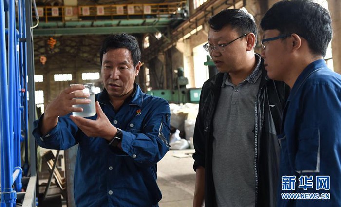 云南冶金昆明重工有限公司首席技師耿家盛(左)在車間里和助手查看生態(tài)環(huán)保廁所的沖水系統(tǒng)經(jīng)過循環(huán)后的水質(9月22日攝)。新華社記者 藺以光 攝