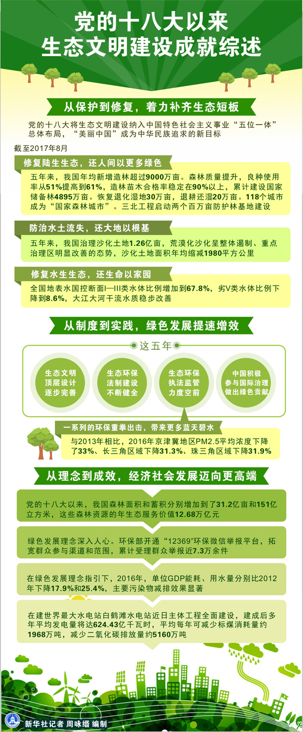 黨的十八大以來,在以習(xí)近平同志為核心的黨中央領(lǐng)導(dǎo)下,綠色發(fā)展、綠色生活理念深入人心,中國(guó)經(jīng)濟(jì)社會(huì)發(fā)展更加充滿活力,生態(tài)文明建設(shè)推動(dòng)中華民族在偉大復(fù)興征程中闊步前進(jìn)。