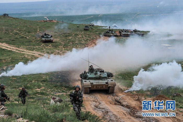 “跨越-2016·朱日和A”演習進入實兵對抗陣地進攻戰(zhàn),這是紅藍雙方首場對抗中紅軍步兵和坦克協同(2016年7月19日攝)。新華社發(fā)(王佳寅 攝)