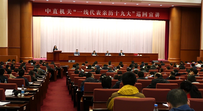 新華網(wǎng)北京11月14日電 11月14日,中直工委在京舉行中直機(jī)關(guān)“一線代表親歷十九大”巡回宣講首場(chǎng)報(bào)告會(huì),來自中直機(jī)關(guān)工作第一線的黨的十九大代表進(jìn)行了宣講。中直機(jī)關(guān)300多名青年干部職工參加。