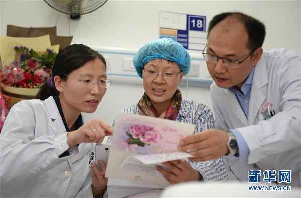 郭璐萍(中)在觀看即將援非的醫(yī)療隊成員為她創(chuàng)作的詩歌和集體簽名卡片。