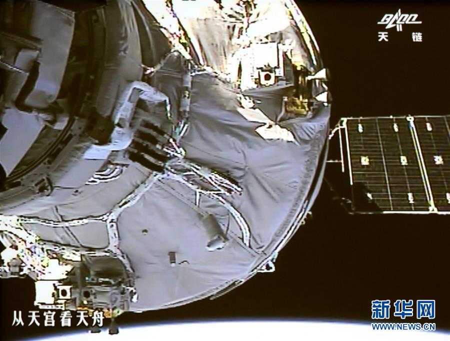 4月22日,北京航天飛行控制中心大廳大屏幕顯示天舟一號與天宮二號自動(dòng)交會對接畫面。這是天舟一號與天宮二號進(jìn)行的首次自動(dòng)交會對接,也是我國自主研制的貨運(yùn)飛船與空間實(shí)驗(yàn)室的首次交會對接。(新華社發(fā)王泗江 攝)