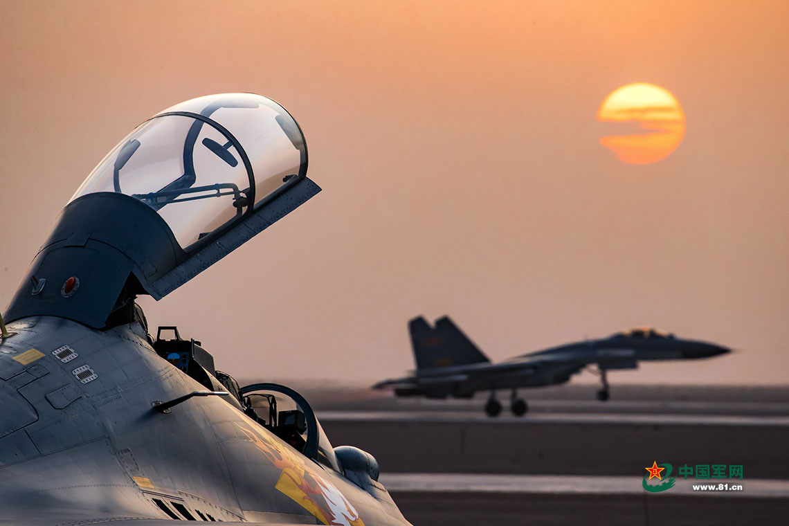 “金頭盔-2017”空軍對(duì)抗空戰(zhàn)競(jìng)賽考核,旭日初升,戰(zhàn)機(jī)加力升空。楊盼 攝影