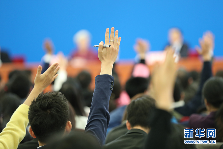 3月15日上午,國務(wù)院總理李克強(qiáng)在人民大會堂三樓金色大廳會見采訪十二屆全國人大五次會議的中外記者并回答記者提出的問題。圖為記者踴躍提問。新華網(wǎng)/中國政府網(wǎng)?孫韜 攝?
