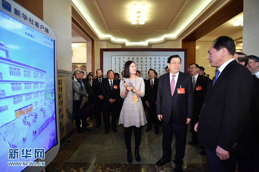 3月14日上午,中共中央政治局常委、全國人大常委會委員長張德江在北京人民大會堂看望參加十二屆全國人大五次會議新聞報道工作的中央主要媒體負責人和工作人員,代表大會主席團向所有參加人大會議報道的新聞工作者表示誠摯慰問和衷心感謝。這是新華社社長蔡名照陪同張德江觀看新華社新聞產品演示。 新華社記者李濤攝