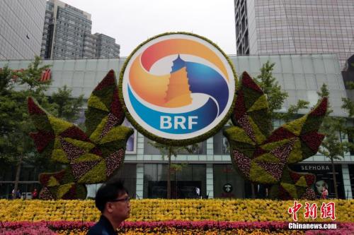 資料圖:2017年5月8日,北京建國路上的“一帶一路”主題花壇。 中新社記者 李慧思 攝