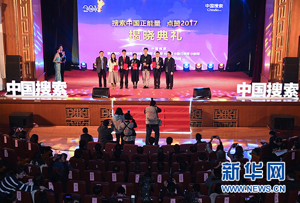 1月19日,“搜索中國正能量點贊2017”活動獲獎企業(yè)代表在頒獎典禮上領(lǐng)獎。當日,由中國搜索創(chuàng)意策劃,聯(lián)合多家中央重點新聞網(wǎng)站和北京大學新媒體研究院共同舉辦的“搜索中國正能量點贊2017”大型網(wǎng)絡(luò)宣傳活動揭曉典禮在北京舉行。此次活動歷時兩月,征集評選出“精彩中國、創(chuàng)新中國、美麗中國、公益中國、品牌中國”五大系列23個熱搜、點贊榜單。新華社記者 李賀 攝