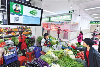 安徽省合肥市瑤海區(qū)勝利智能農(nóng)貿(mào)市場,每個攤位都安裝了電子屏,只需掃碼即可實(shí)現(xiàn)移動支付,還可在平臺對商家進(jìn)行點(diǎn)評、維權(quán)投訴等。掃碼“滴”聲之后,現(xiàn)實(shí)與虛擬被連接,這種黑白方格組成的“時代符號”(二維碼)帶來了便利、快捷和驚喜。 張大崗攝(新華社發(fā))