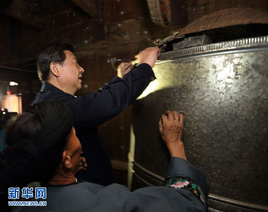 在河北阜平龍泉關鎮(zhèn)駱駝灣村困難戶唐榮斌家,習近平拿起桌上的藥瓶仔細查看,囑咐老人多多保重身體。