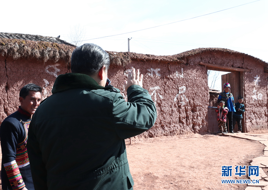 這是2月11日上午,習(xí)近平在涼山彝族自治州昭覺(jué)縣三岔河鄉(xiāng)三河村考察時(shí)同村民打招呼。 新華社記者 鞠鵬 攝