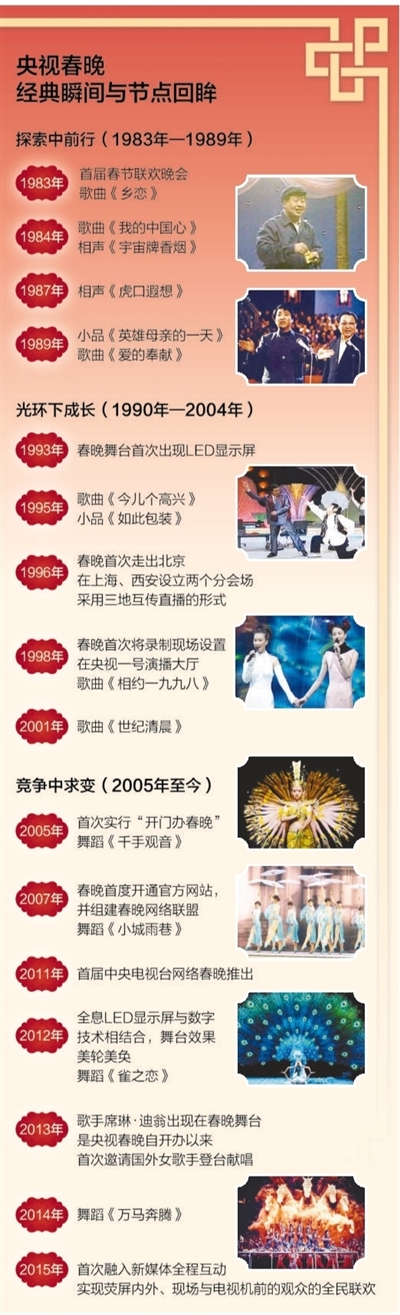 春晚的自我更新還體現(xiàn)在與不同時(shí)代的新興媒體展開合作。如八九十年代的電話熱線,90年代末期興起短信投票,以及新世紀(jì)以來與微博、支付寶、微信的合作。正是這種在表演形式、舞臺風(fēng)格上既保持固有特色,又不斷求新求變的創(chuàng)新精神,使得春晚成為每年最受關(guān)注的綜藝大餐。