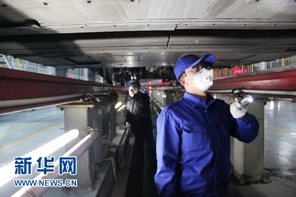 石家莊動(dòng)車運(yùn)用所的檢修工正在作業(yè)。新華網(wǎng) 金佳緒 攝