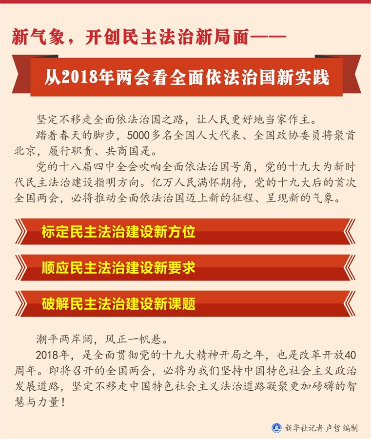 黨的十八屆四中全會(huì)吹響全面依法治國(guó)號(hào)角,黨的十九大為新時(shí)代民主法治建設(shè)指明方向。億萬(wàn)人民滿懷期待,黨的十九大后的首次全國(guó)兩會(huì),必將推動(dòng)全面依法治國(guó)邁上新的征程、呈現(xiàn)新的氣象。