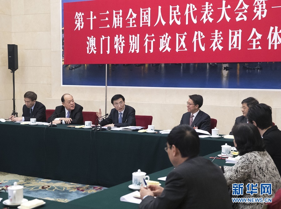 3月6日,中共中央政治局常委、中央書記處書記王滬寧參加十三屆全國(guó)人大一次會(huì)議澳門代表團(tuán)的審議。 新華社記者王曄攝