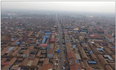 3月31日,航拍六道口村,主干道約兩公里的街道兩旁都是賣殯葬用品的店。