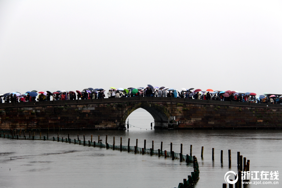 4月5日,清明小長(zhǎng)假首日,杭州細(xì)雨綿綿,西湖景區(qū)游客絡(luò)繹不絕。杭城雖降雨降溫,但西湖景區(qū)前來賞花踏青的游客如潮,斷橋似人橋。(浙江在線拍友 里爾 柱子 攝)