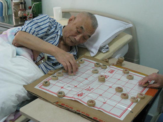 德勝社區(qū)衛(wèi)生服務(wù)中心臨終關(guān)懷科一位正在下象棋的老爺爺。該科室護(hù)士長劉曉惠說,這位老爺爺唯一的愛好就是下象棋,“要是下跳棋我們還能陪一陪,象棋都不會”。于是,醫(yī)院便找了一位會下棋的護(hù)工陪這位老爺爺下象棋。圖片中下象棋用的硬紙板也是護(hù)士們幫忙做的。德勝社區(qū)衛(wèi)生服務(wù)中心臨終關(guān)懷科供圖