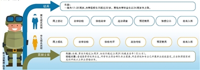 男青年應征需經(jīng)過網(wǎng)上登記、初審初檢、體檢政審、走訪調(diào)查、預定新兵、張榜公示、批準入伍7個環(huán)節(jié)。