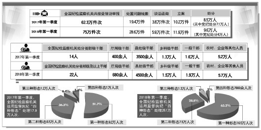 4月18日,中央紀(jì)委國家監(jiān)委通報(bào)稱,2018年第一季度,全國紀(jì)檢監(jiān)察機(jī)關(guān)共接受信訪舉報(bào)75萬件次,立案11.9萬件,黨紀(jì)處分8萬人。