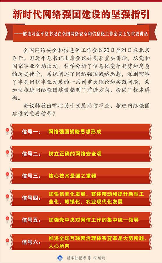 全國網(wǎng)絡安全和信息化工作會議20日至21日在北京召開。習近平總書記出席會議并發(fā)表重要講話,從黨和國家事業(yè)全局出發(fā),科學分析了信息化變革趨勢和肩負的歷史使命,系統(tǒng)闡述了網(wǎng)絡強國戰(zhàn)略思想,深刻回答了事關(guān)網(wǎng)信事業(yè)發(fā)展的一系列重大理論和實踐問題,為加快推進網(wǎng)絡強國建設指明了前進方向、提供了根本遵循。