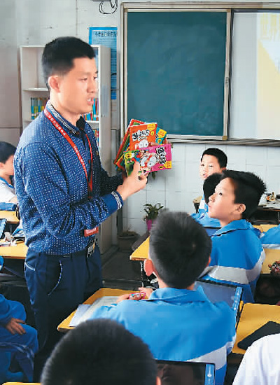4月23日,江西省新余市分宜縣的執(zhí)法人員在分宜縣第一小學(xué)向?qū)W生講解盜版書籍的鑒別方法。周亮攝(人民視覺)
