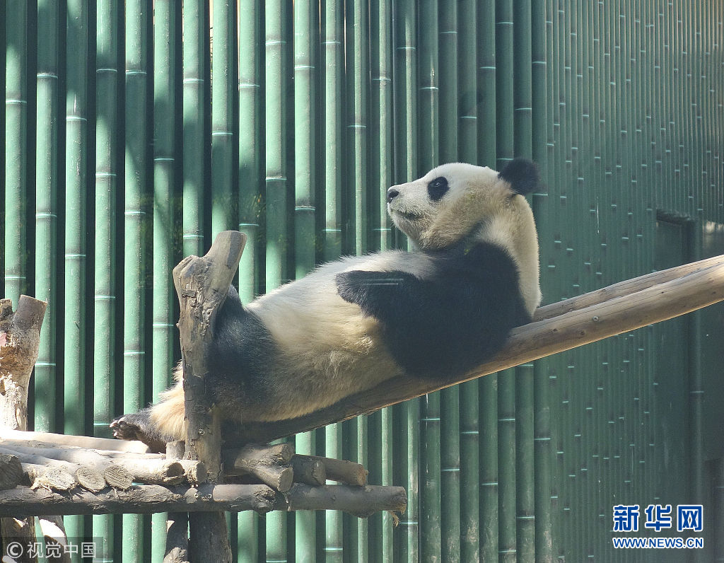 5月2日,在動物園內,熊貓曬著太陽,時不時伸個懶腰,翻個身,笨拙的動作盡顯萌態(tài)。(圖片來源:視覺中國)