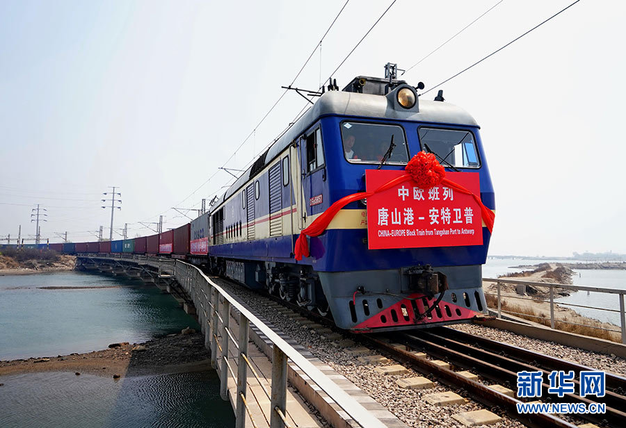 發(fā)往比利時安特衛(wèi)普的國際集裝箱班列從河北唐山港京唐港區(qū)駛出(4月26日攝)。唐山港京唐港區(qū)當日正式開通中歐國際集裝箱班列。新華社記者 楊世堯 攝