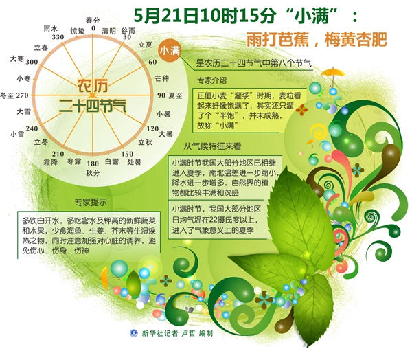 北京時間5月21日10時15分將迎來“小滿”節(jié)氣。逢此時節(jié),夜鶯輕啼,雨打芭蕉,梅黃杏肥。從氣候特征來看,小滿時節(jié)我國大部分地區(qū)已相繼進(jìn)入夏季,南北溫差進(jìn)一步縮小,降水進(jìn)一步增多,自然界的植物都比較豐滿和茂盛。小滿時節(jié),我國大部分地區(qū)日均氣溫在22攝氏度以上,進(jìn)入了氣象意義上的夏季。由于氣溫升高很快,人體難以適應(yīng),要特別注意養(yǎng)生調(diào)節(jié)。>>