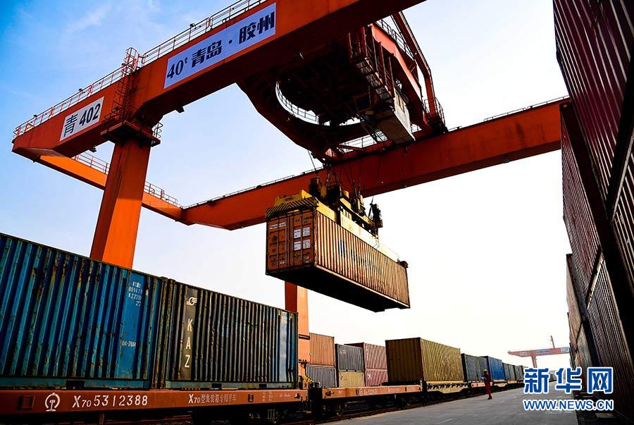 在青島膠州灣國(guó)際物流園,龍門塔吊在往中亞班列上裝載貨物(2018年5月7日攝)。該班列將通過(guò)阿拉山口至哈薩克斯坦的阿拉木圖。新華社記者 郭緒雷 攝