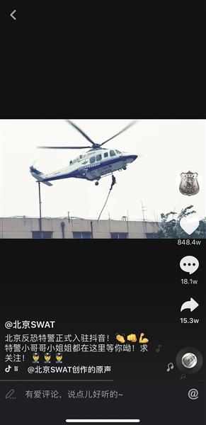 5月3日下午4點(diǎn)左右,陳陽(yáng)通過(guò)北京市公安局反恐特警總隊(duì)的抖音賬號(hào)“北京SWAT”發(fā)布了一條37秒的視頻,搭配著當(dāng)下最熱門(mén)的“吃雞”音樂(lè),特警隊(duì)員用各種姿勢(shì)持槍射擊,從直升機(jī)上順梯空降,步步逼近“作戰(zhàn)現(xiàn)場(chǎng)”。