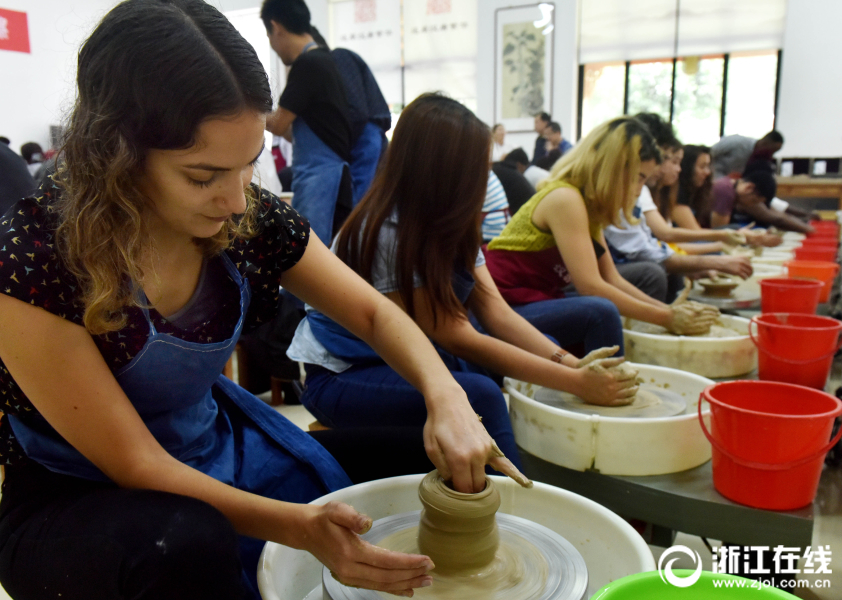 2018年6月3日,來自30多個國家的70多名留學(xué)生,在武義漢坊婺窯體驗(yàn)館開心學(xué)習(xí)拉坯。
