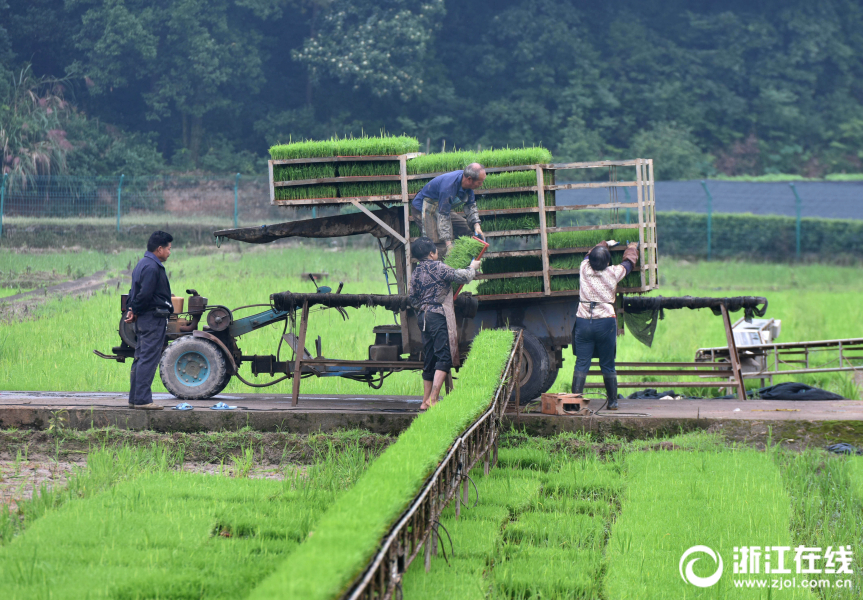 武義縣一育秧工廠員工忙著為訂單農戶起運單季稻秧苗。