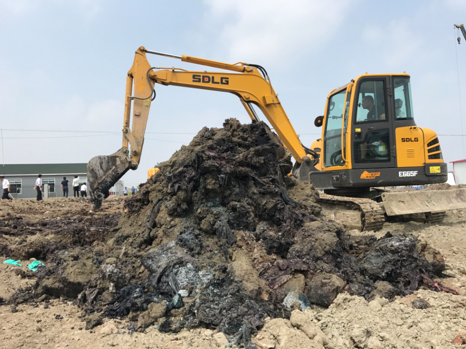 6月15日,也即中央第四環(huán)保督察組下沉泰州市當(dāng)日,督察人員便調(diào)來挖掘機(jī),對群眾舉報(bào)區(qū)域隨機(jī)選點(diǎn)進(jìn)行試探性挖掘。讓人沒有想到的是,僅僅數(shù)鏟之后,半米左右的沙土層之下就現(xiàn)出黑色的化工廢料,刺激性氣味強(qiáng)烈。
