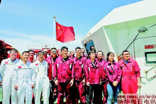 今年上半年,新華每日電訊記者跟隨我國(guó)新一代海洋科學(xué)考察船“科學(xué)”號(hào),到西太平洋麥哲倫海山進(jìn)行為期40多天的科學(xué)考察?!叭嗽谝黄鸾芯蹠?huì),心在一起叫團(tuán)隊(duì)”,在科考船上,一批共產(chǎn)黨員挑起了工作的大梁,黨旗在海風(fēng)中高高飄揚(yáng)。