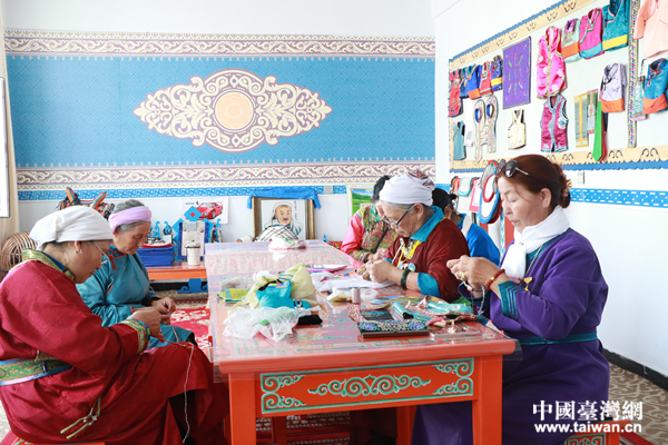 薩仁格日勒(右三)與朋友們縫制民族服飾。(中國臺(tái)灣網(wǎng) 李寧 攝)