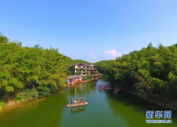 游人乘坐竹排在蜀南竹海內游覽。新華社記江宏景攝