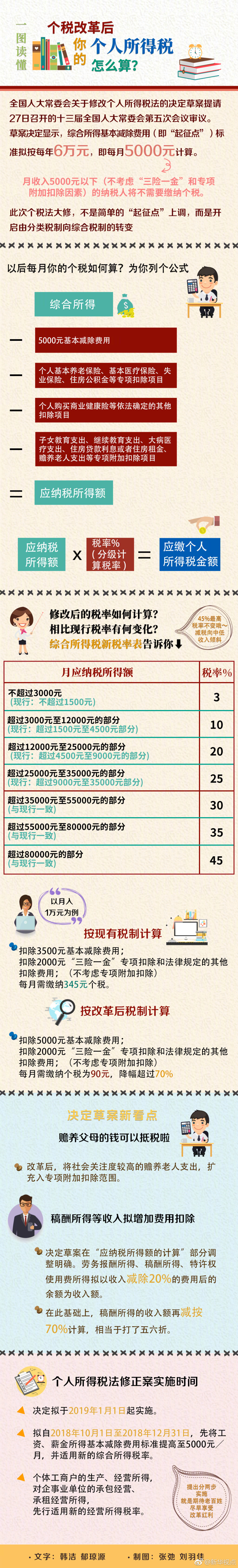 改革后,基本減除費(fèi)用標(biāo)準(zhǔn)提至每月5000元,“三險(xiǎn)一金”專項(xiàng)扣除繼續(xù)保留的同時(shí),低檔稅率級(jí)距拉大,納稅人只需繳納90元,降幅超過70%。如果加上增加的專項(xiàng)附加扣除項(xiàng)目,扣除額實(shí)際高于每月5000元,減負(fù)力度會(huì)更大。