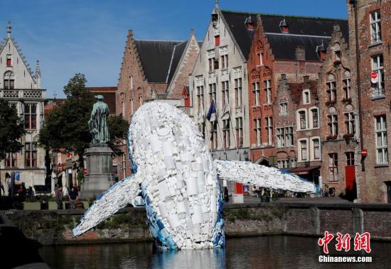 資料圖:當(dāng)?shù)貢r(shí)間7月2日,來自紐約布魯克林的建筑設(shè)計(jì)公司StudioKCA用從海洋中打撈起來的5噸塑料垃圾,打造了一個(gè)38英尺(約11.6米)高的巨型鯨魚“摩天大樓”(Skyscraper)。提醒人們關(guān)注塑料污染。