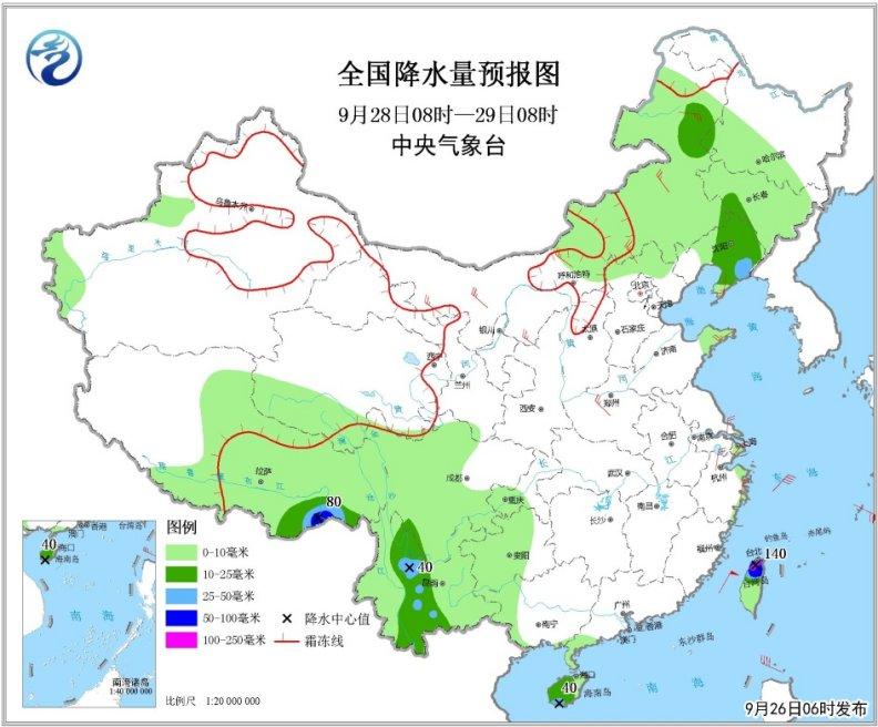 9月28日08時(shí)至29日08時(shí),內(nèi)蒙古中東部、東北地區(qū)中南部、西南地區(qū)西南部和海南島大部以及西藏中東部等地的部分地區(qū)有中到大雨,局地有暴雨或大暴雨(50~140毫米)(見圖3)。東海大部海域、臺灣海峽、臺灣以東洋面、南海東北部海域、巴士海峽將有7~8級、陣風(fēng)9~10級大風(fēng),其中東海東南部海域、臺灣以東洋面的部分海域風(fēng)力可達(dá)9~11級、陣風(fēng)12~13級。