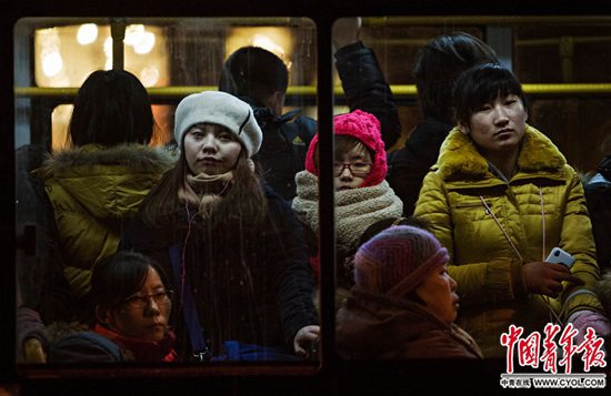 北京街頭的公交車上,身陷下班晚高峰的人們,日復(fù)一日地忍耐著通勤壓力。記者 鄭萍萍/攝